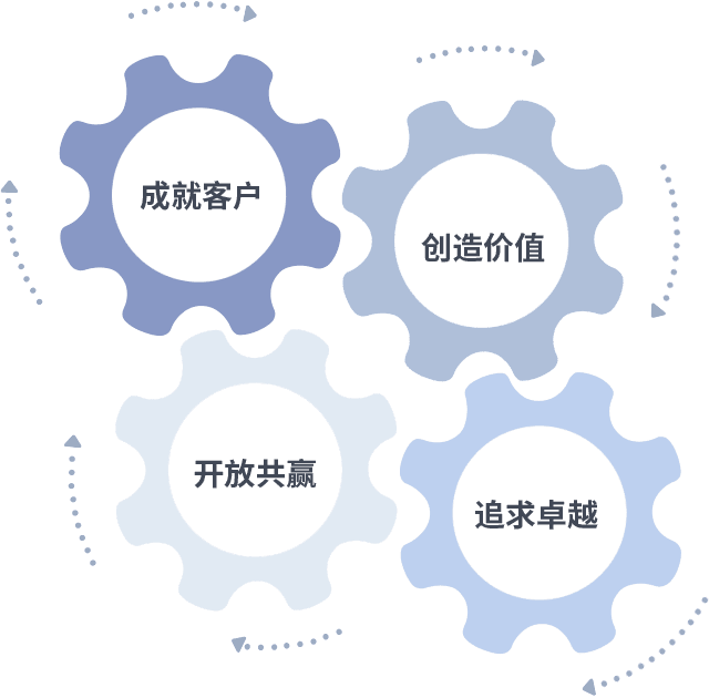 成就客户是一切决策的出发点,,创造价值是衡量所有工作的标准,,,追求卓越是我们做事做人的态度,,,,开放共赢是我们的格局也是最终的结果。。。价值观的齿轮环环相扣,,,推动着组织里的每个人不断向前。。。。