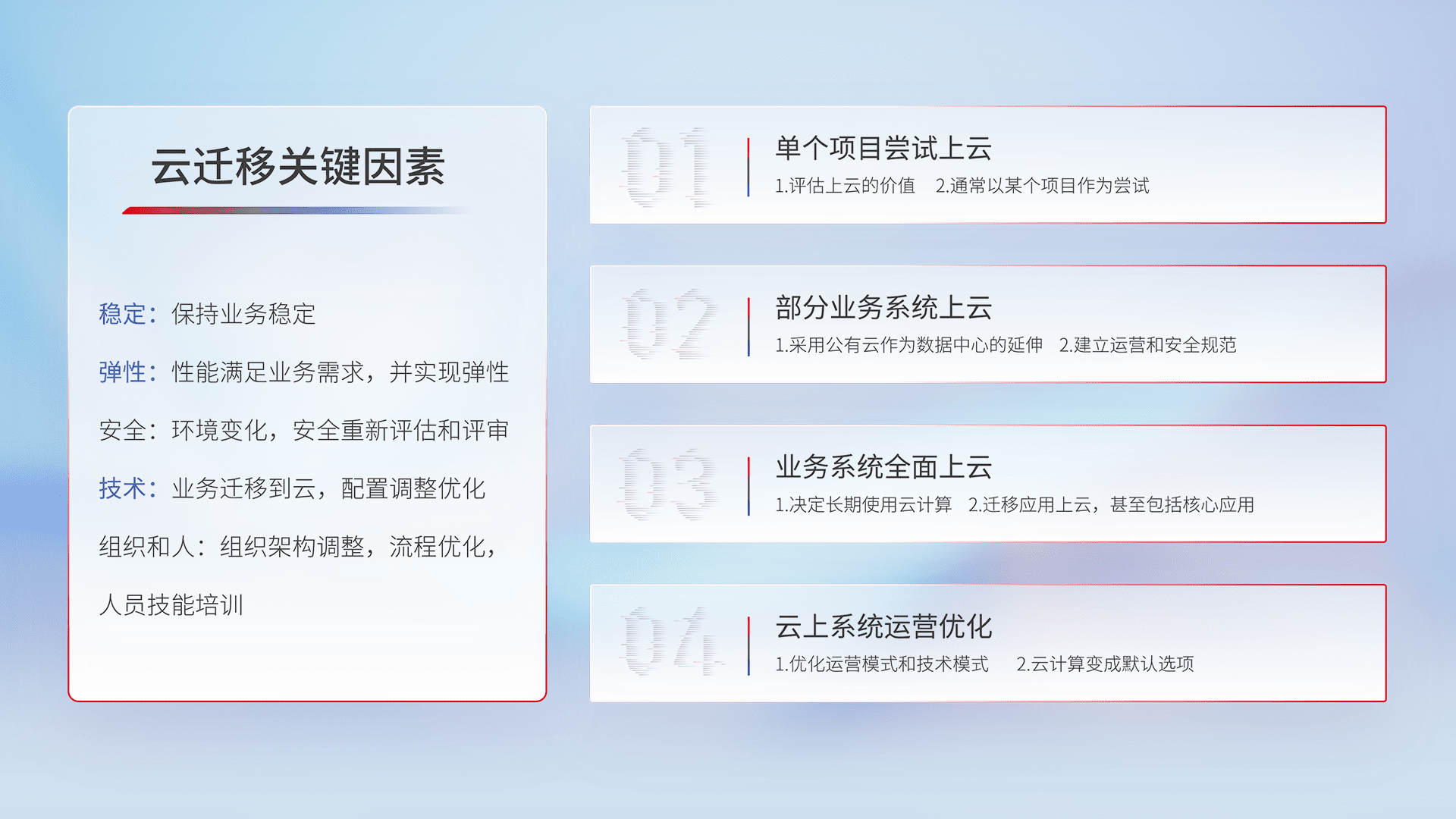 结合实际业务,,从规划设计、、云平台选型、、、、云原生改造、、数据迁移、、、、集成交付,,迁移全过程为客户识别最佳上云路径,,,做好风险识别管理,,设计网络架构、、身份权限、、安全审计合规、、操作审计、、、日志审计、、、、监控告警策略、、、、多站点容灾设计等,,,对云上基础设施进行整体规划,,,,提升IT治理水平,,以满足弹性、、、高可用、、、、高性能的需求。。