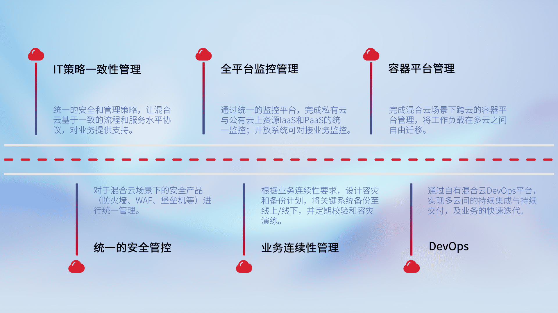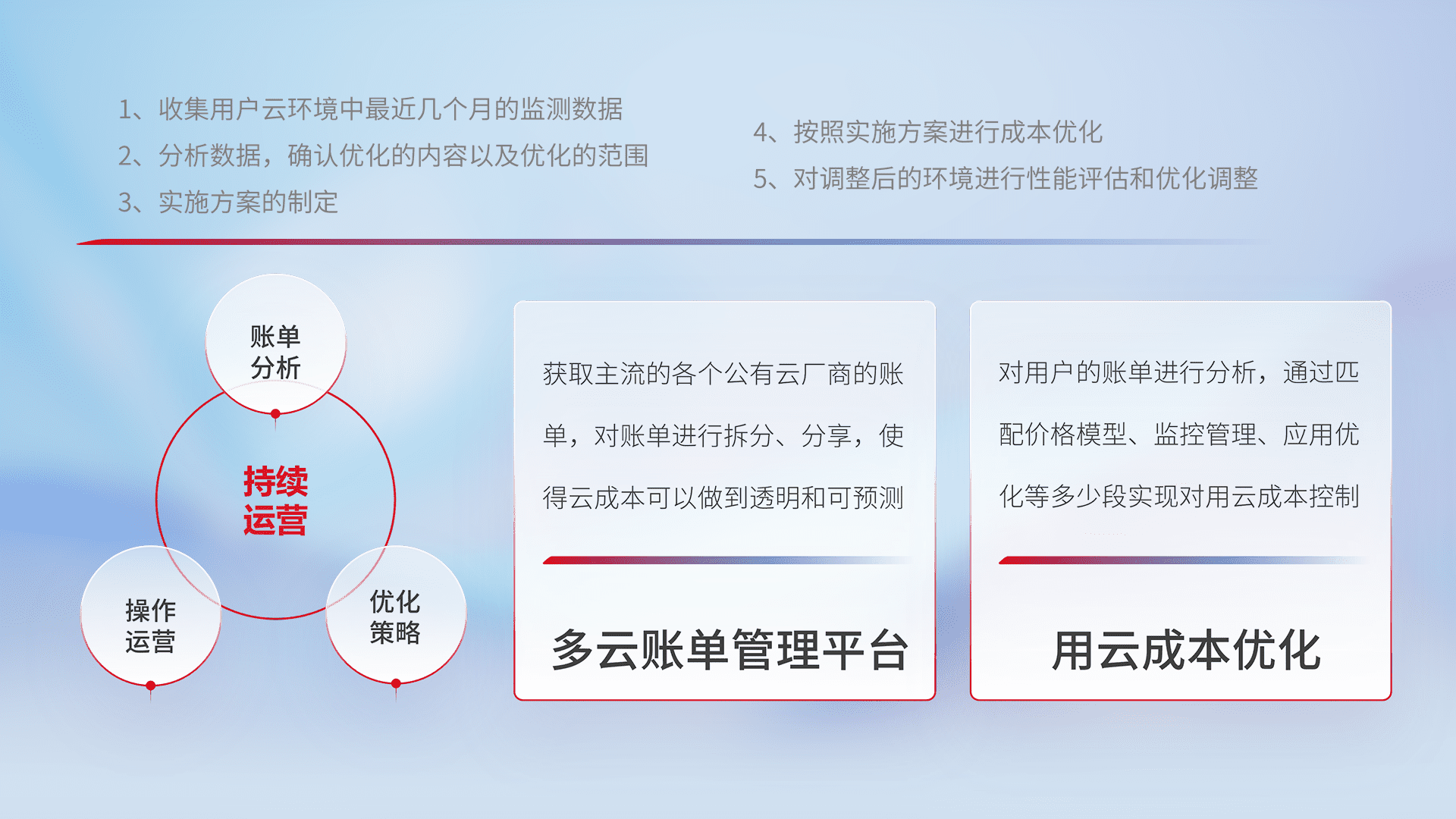 通过多云纳管,,以统一的资源数据模型把客户的云资源进行抽象和封装,,,,进而实现对多云资源的统一操作,,,保障云资源管理的可靠性、、、稳定性与可用性。。。。量身定制化运维内容,,,,配置、、、开发运维、、补丁管理、、、备份、、、、监控、、、认证和访问管理、、、审计和日常巡检等,,保障在用云过程中的可靠度,,,稳定度以及高可用率。。。