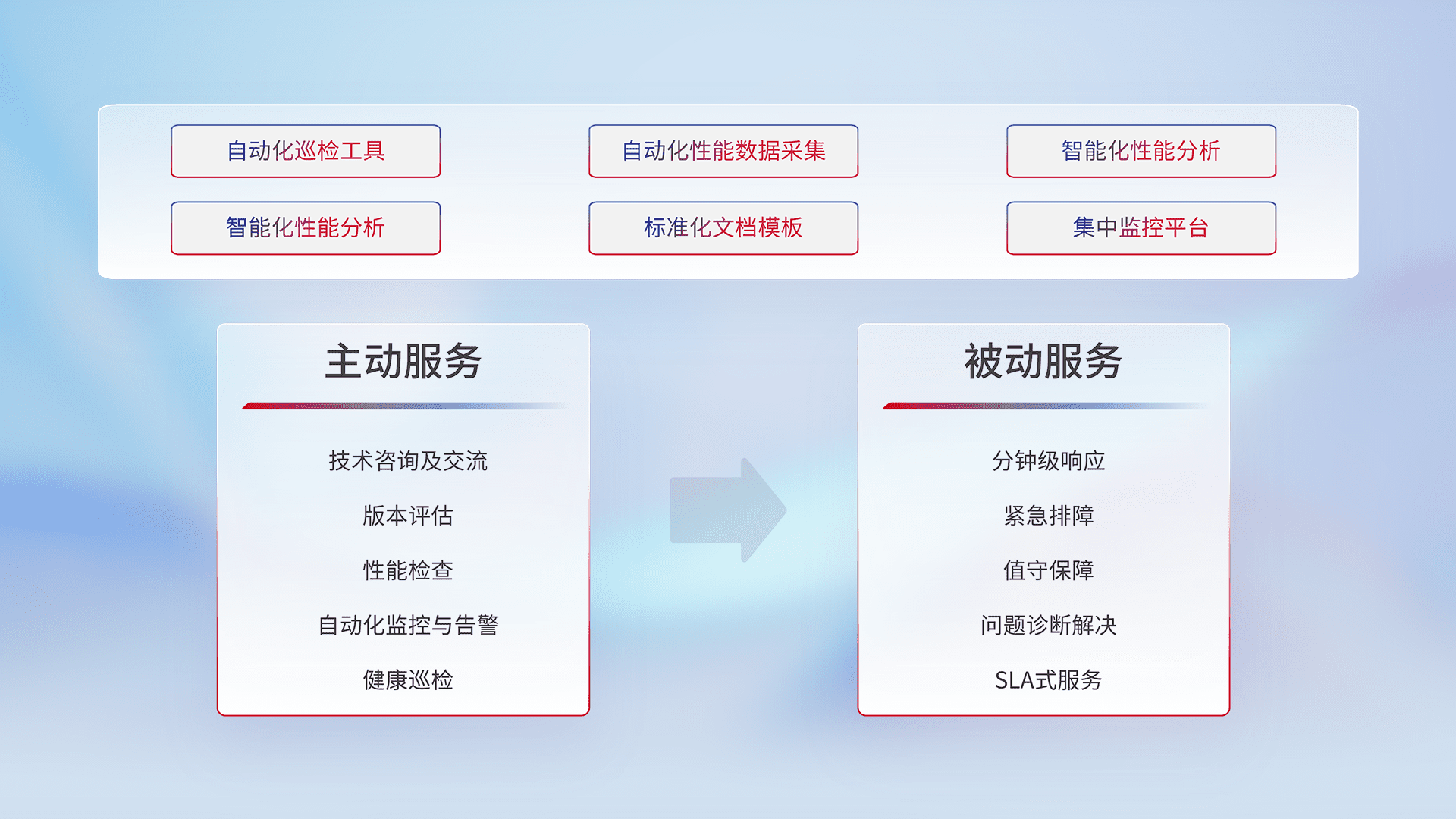 智能化工具和标准化文档,,,保障服务质量,,,,提供主动服务(包含技术咨询、、、版本评估、、、性能检查、、、、自动化监控与告警、、健康巡检)和被动服务包含(分钟级响应、、紧急排障、、、值守保障、、问题诊断解决、、、、SLA服务)。。。