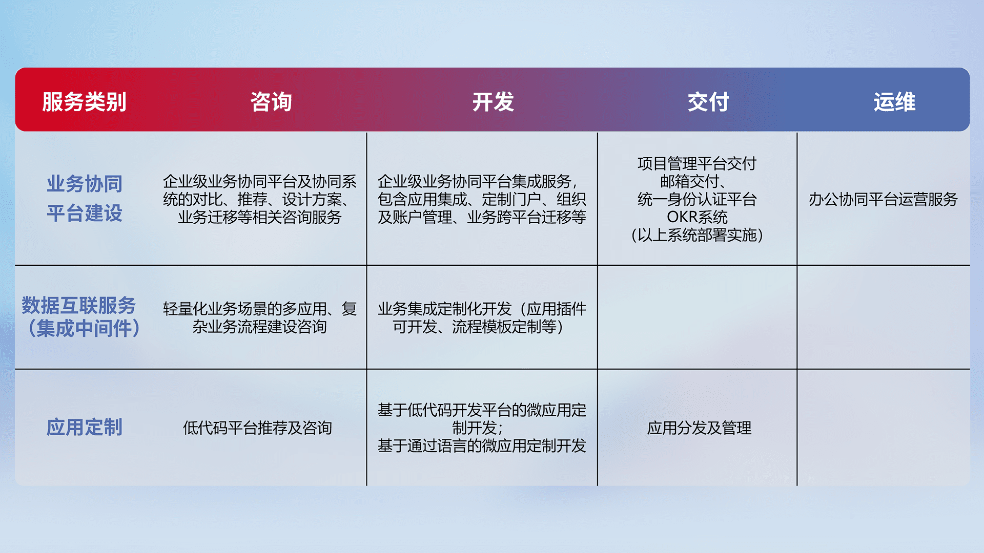 针对钉钉、、、、企微、、IDaas等平台级产品提供产品的规划、、方案、、交付、、、、定制化开发等服务,,实现如统一协同办公、、智能客户服务、、、、混合会议管理、、智能数据查询、、、等业务场景,,实现数字化转型。。